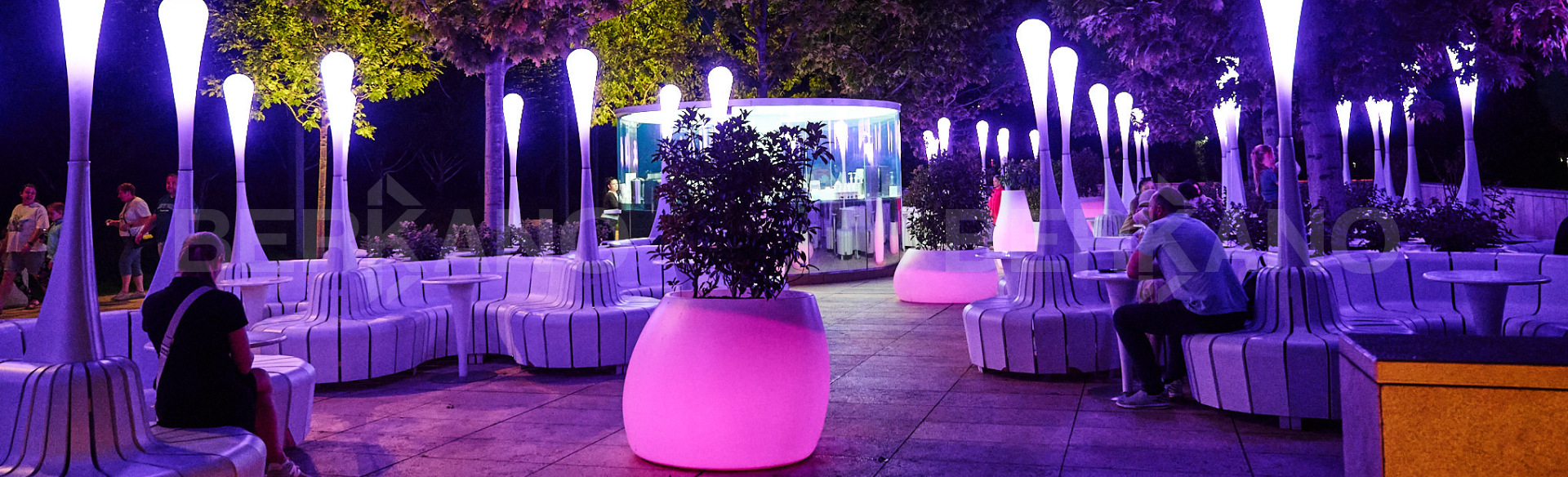 В зоне зеркального бара под открытым небом установлены кашпо коллекции Bend — выразительные формы, мягкая подсветка и идеальная сочетаемость с окружающей архитектурой делают их важным элементом композиции.