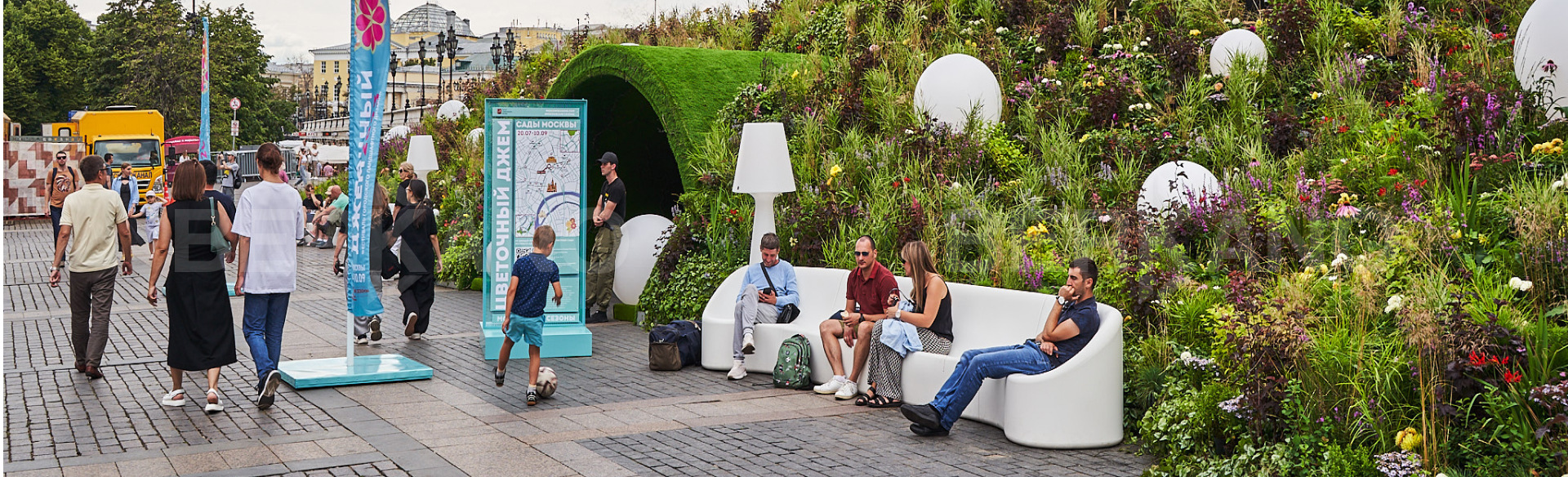 На Манежной площади, которая превратилась в огромный цветущий сад, Вы можете расслабиться на удобной модульной мебели из коллекции Smoov Line. Она делает пространство не только привлекательным, но и функциональным.