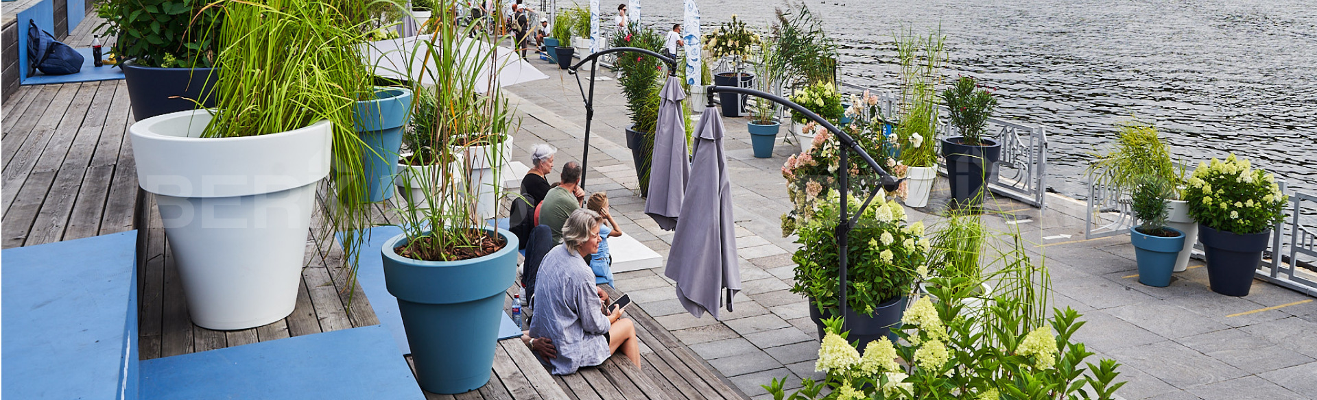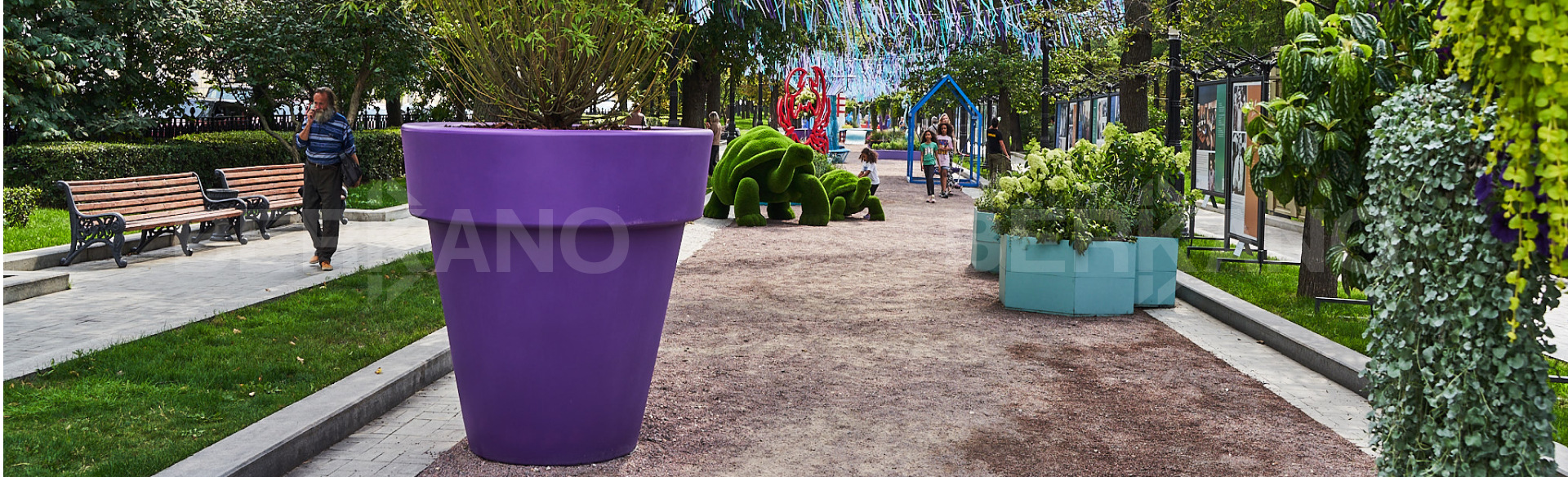 На Лужнецкой набережной реки Москвы были установлены наши кашпо из коллекции Classic, имеющие разных размеров и цветов. Они идеально гармонируют с окружающим пейзажем и рекой, выделяясь на фоне набережной.