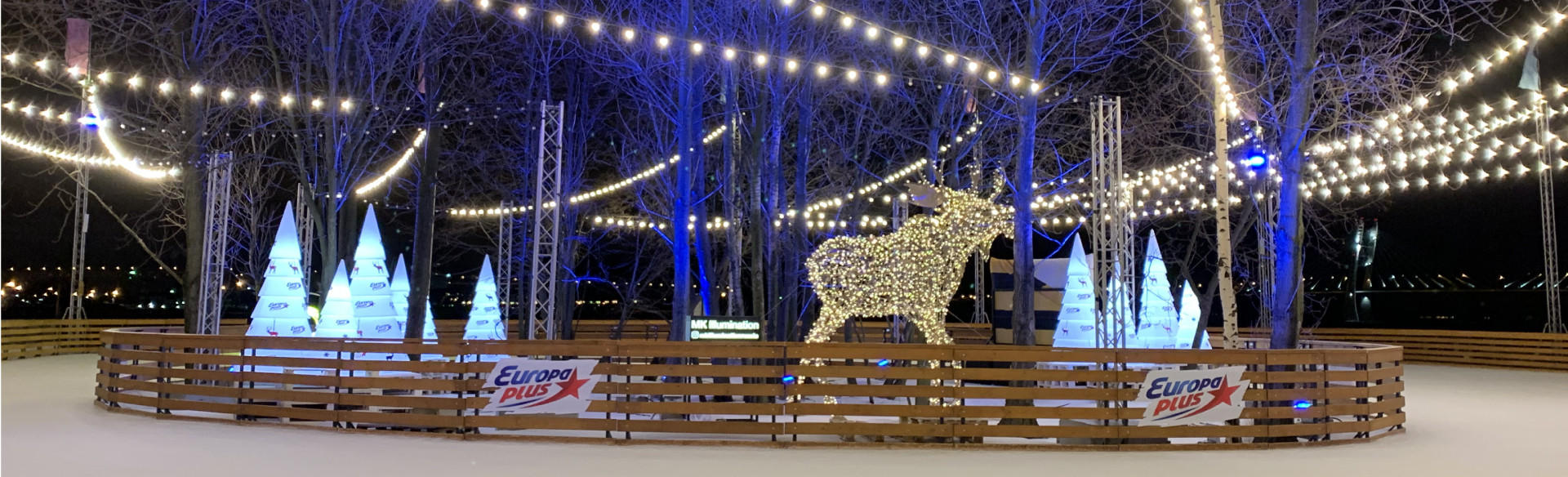 Весь зимний сезон в центре катка был установлен остров с декорациями. Для брендированния острова заказчик использовал изделия Eiswald в трёх размерах 1.5м, 2.0м, 2.5м. На территории острова были размещены 4 группы ёлок Eiswald с белой подсветкой и фирменном брендингом. Брендинг был нанесён таким образом, чтобы обеспечить достаточную видимость бренда с любой точки наблюдателя и попадание бренда в объектив фотокамер при любом ракурсе.