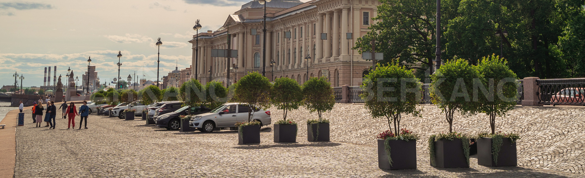 Университетская набережная и набережная Лейтенанта Шмидта - новая локация, где установили изделия BERKANO. Деревья на парковке были высажены в наши кашпо и уже прошли испытания погодными условиями.