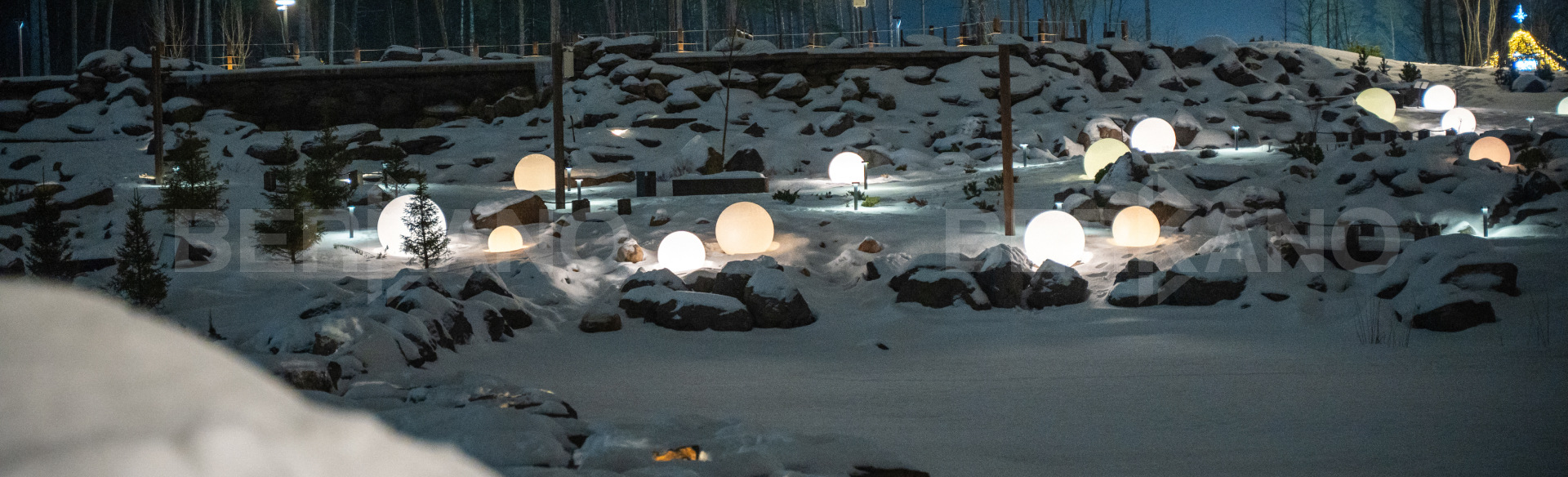 В лесной зоне Маслово установили яркие зимние композиции: шары ORBY, снеговики MR.SNOWMAN и ели EISWALD.