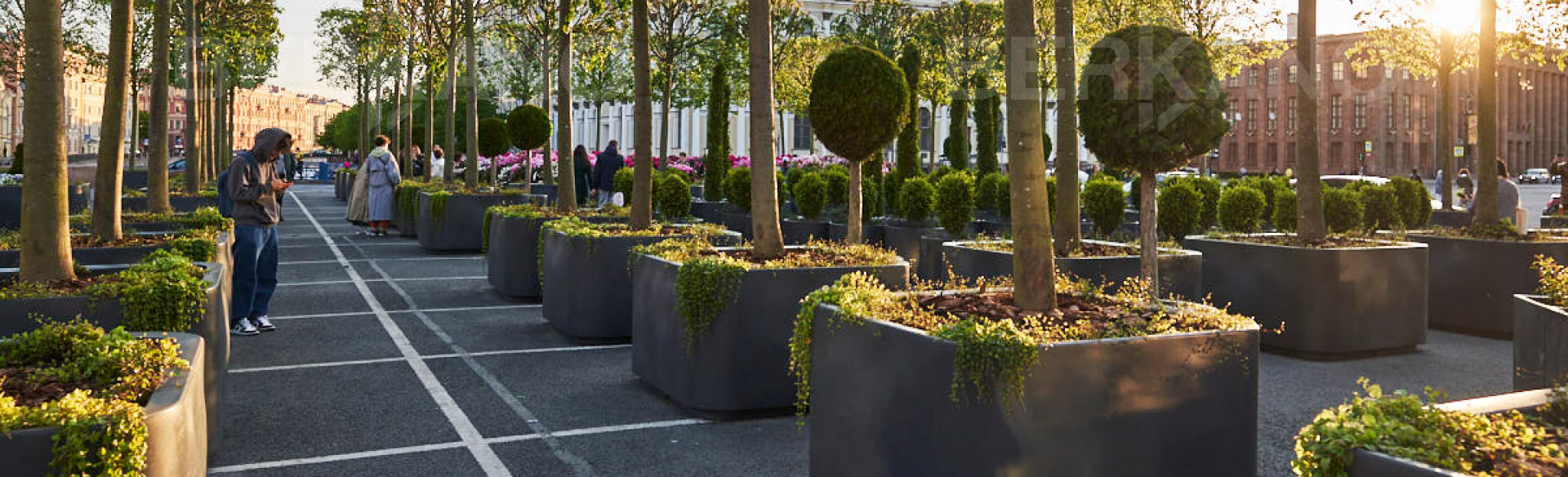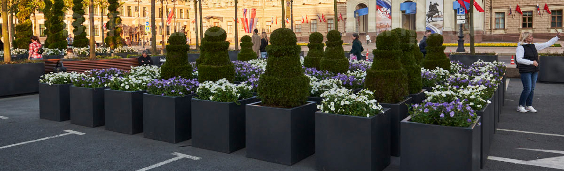 Накануне 320-летия со дня основания Санкт-Петербурга на Исаакиевской площади открыли регулярный летний сад. В кашпо производства Berkano высажены 104 липы, а также туи, клёны и другие растения и цветы.