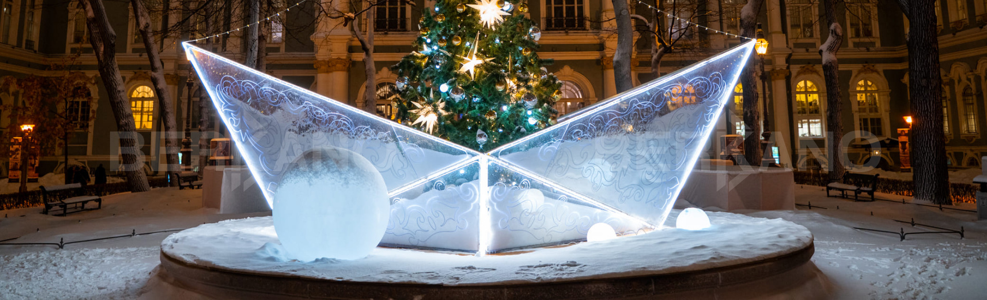Посередине двора к Новому году установили арт-объект, который включает в себя бумажный корабль - символ связи поколений и надежд, а также новогоднюю елку. Вся композиция дополнена изделиями Orby и Orion.