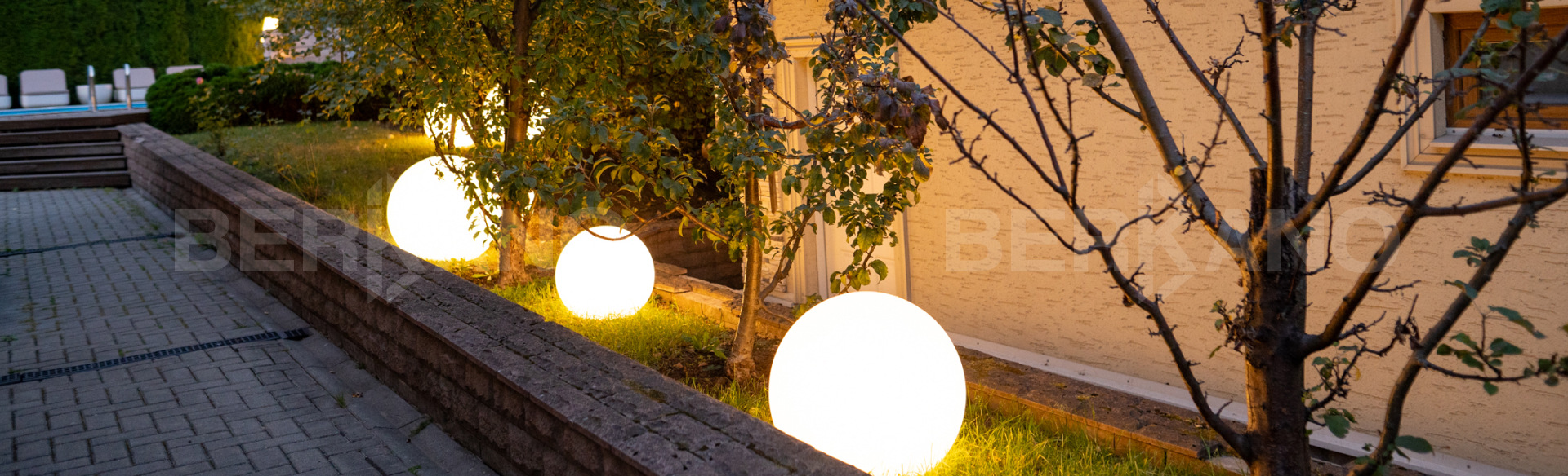 - На всем участке установлены шары ORBY разных размеров. Они служат не только для освещения участка, но и элементом украшения.